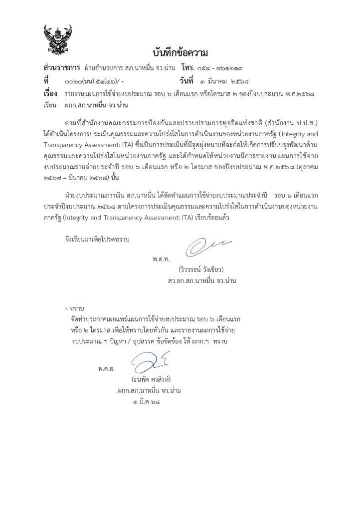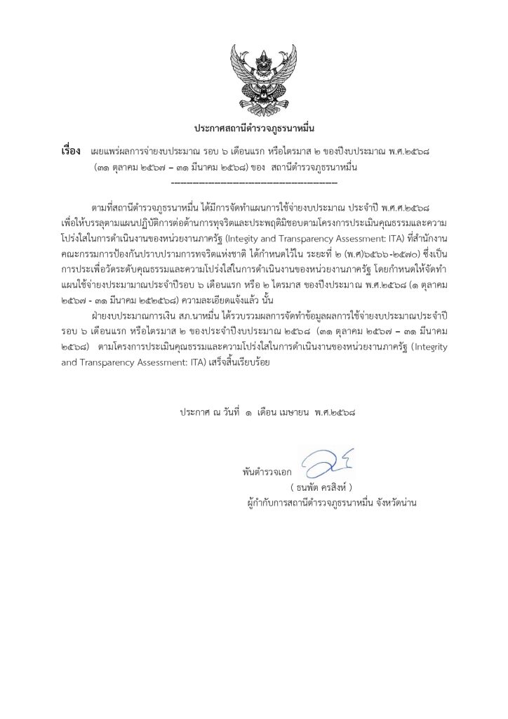 แผนการใช้จ่ายงบประมาณ ประจำปีงบประมาณ 2568 สถานีตำรวจภูธรนาหมื่น จังหวัดน่าน