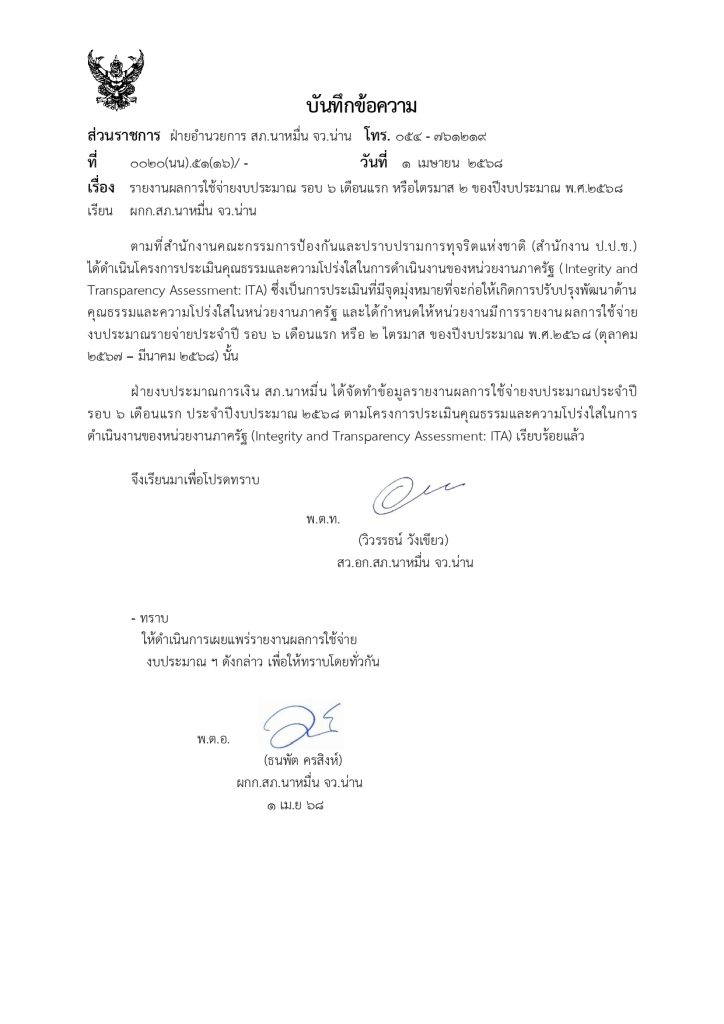 รายงานผลการใช้จ่ายงบประมาณ ประจำปีงบประมาณ 2568 สถานีตำรวจภูธรนาหมื่น จังหวัดน่าน